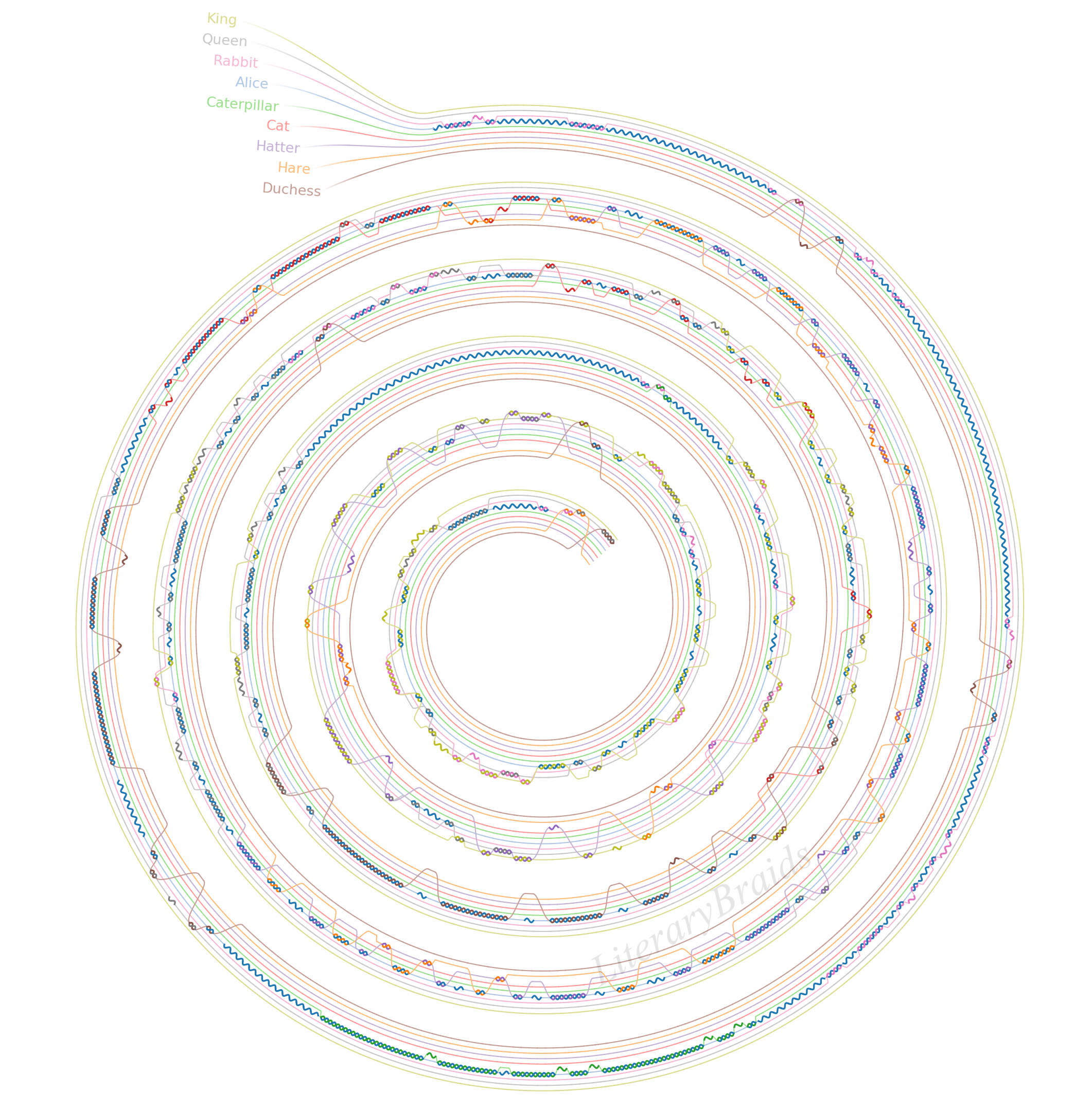 This is a legacy post about a pet-project of mine called Literary Braids. It arose as a way of visualizing character interactions between characters in a literary work. Chracters are plotted as threads, which entangle and “braid” as the narrative progresses. For example, this is what Alice’s Adventures in Wonderland look like from this perspective: